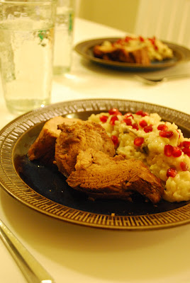 Jag tillagade en fläskfilé i ugnen till risotton. Lägg filén i ugnsform, häll över soja, peppar och citron. Jag använde också någon slags obestämbar chili i pulverform som jag köpt i Bolivia. Låt stå i 35-40 minuter i ca 220 C. Ös några gånger så att det inte blir torrt och bränt. Skär upp i skivor.